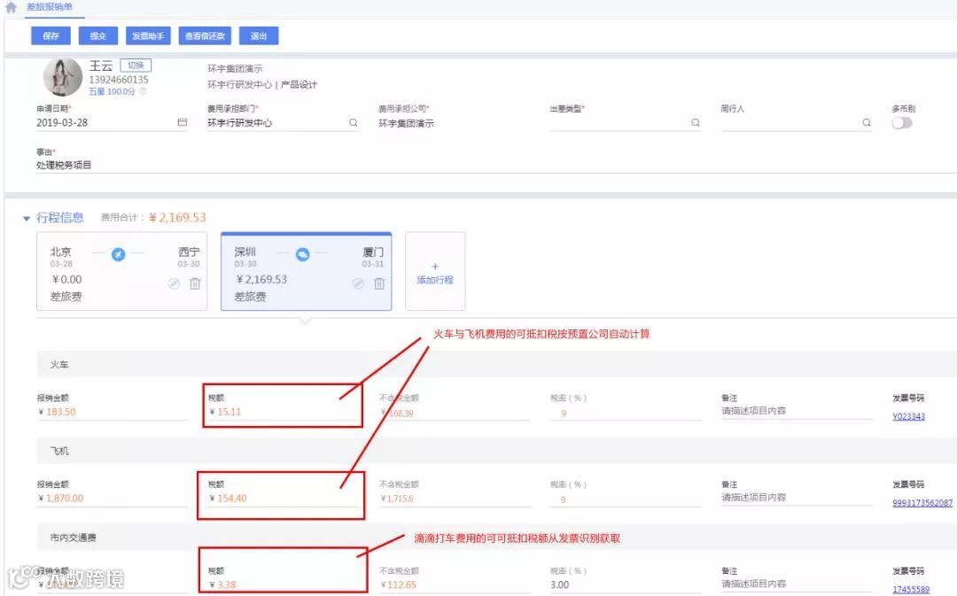 1.差旅报销单机票、火车票、汽车票等项目价税分离,并按预置计算公式计算可抵扣税额(如下图):