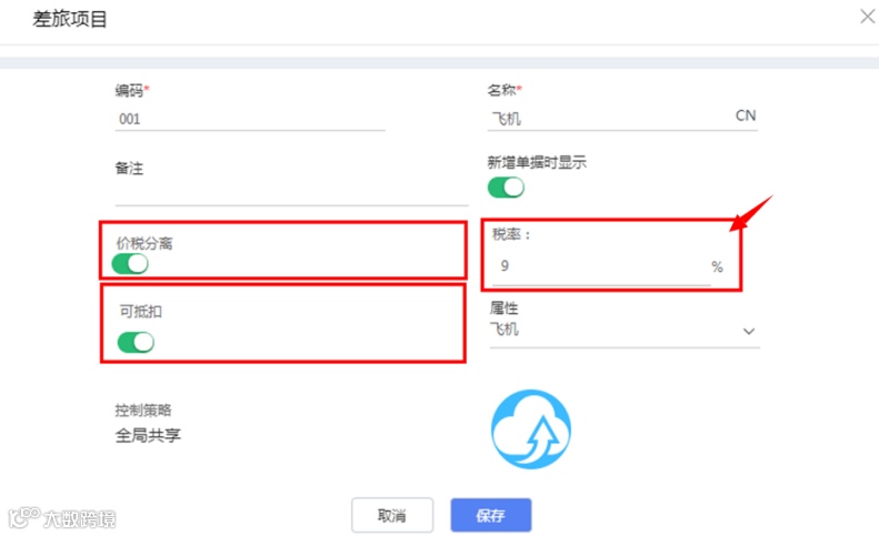 1.【差旅项目】在差旅项目预置相关信息,包括:税率与可抵税额计算规则(如下图):