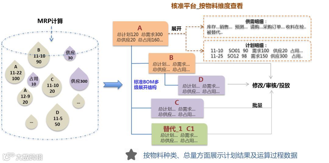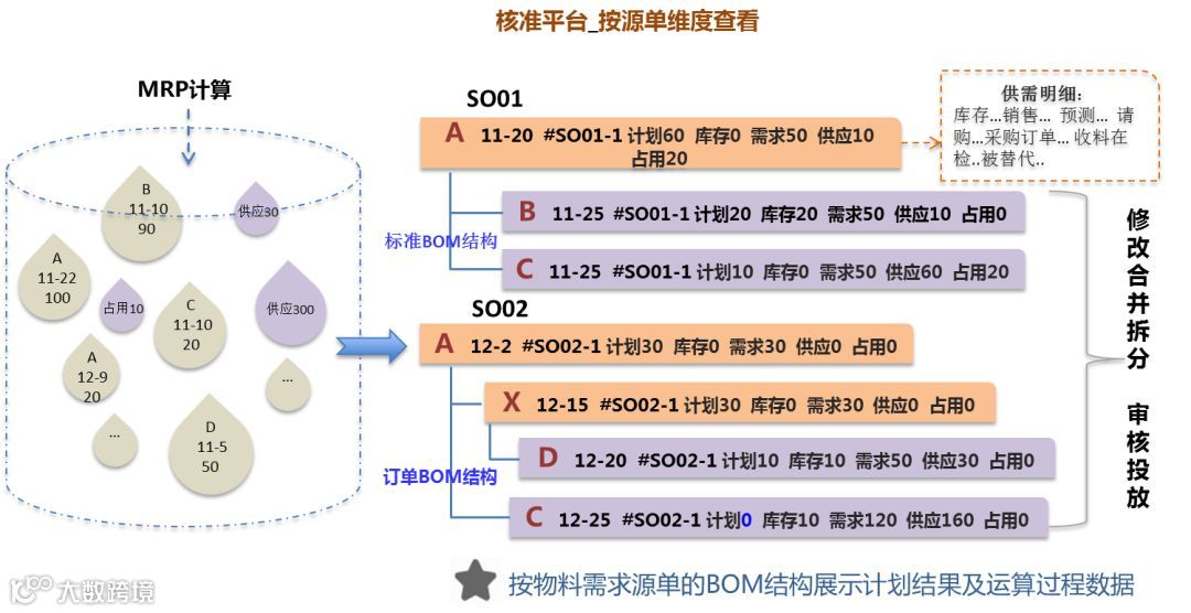 增加PMC平台-“核准平台”,以BOM层级形式按物料、源单两种维度,横向直观展示计算结果和计算结果相应的计算过程,并给出“生产计划”、“采购计划”、“委外计划”,便于不同业务处理的多个计划员快速找到相应的需“核对”的物料计划,并快速调整及精准下发计划。