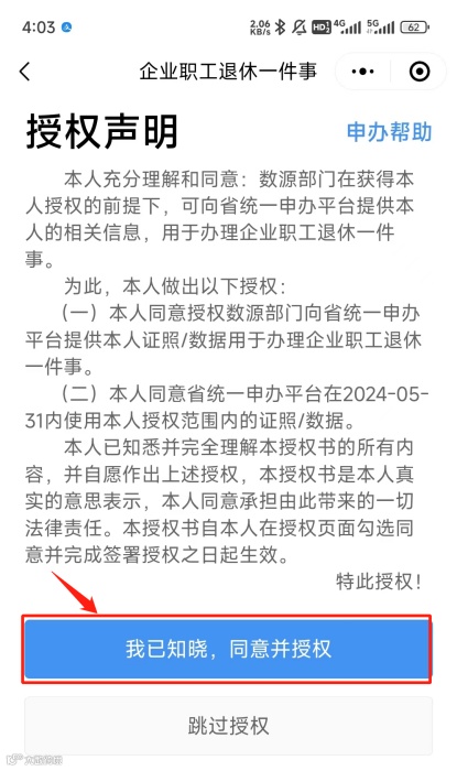 第二步:自检授权。点击【企业职工退休一件事】,进入申办页面。登录验证后,阅读办理须知,对办理条件进行自检,自检通过后点击【开始导办】。正式办理业务前,需先阅读相关授权声明,确认后点击【我已知晓,同意并授权】。