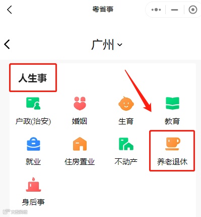 第一步:登录查找。微信搜索“粤省事”小程序,在首页模块,点击【更多服务】→在【人生事】版块,选择【养老退休】,然后进入事项办理页面。