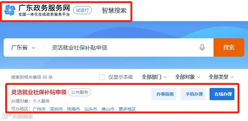 1、“广东政务服务网”办理:进入官网后搜索【灵活就业社保补贴申领】→点击对应服务并按指引办理即可。
