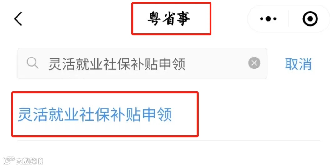 2、“粤省事”微信小程序办理:登录小程序→在首页搜索【灵活就业社保补贴申领】并点击并进入服务,按指引申领即可。