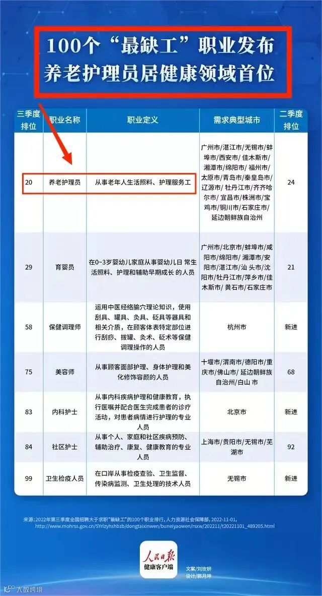 2022年,人力资源和社会保障厅发布第三季度全国“最缺工”的100个职业排行。据人民日报健康客户端统计,涉及大健康领域的职业有7个,其中养老护理员(排名20)、育婴员(排名29)等。