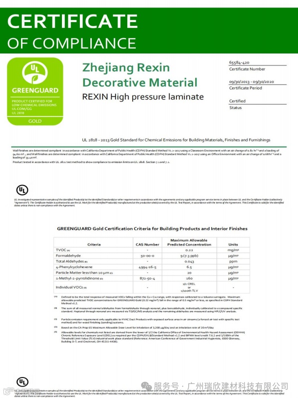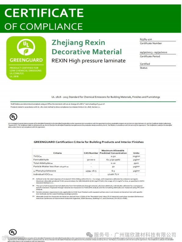 瑞欣拥有美国UL室内空气认证、美国UL室内金级认证、新加坡绿色认证