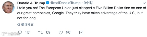 特朗普在Twitter上称:“欧盟刚刚对我们最伟大的公司之一谷歌处以50亿美元的罚款,他们占了美国的便宜,但不会太久。”