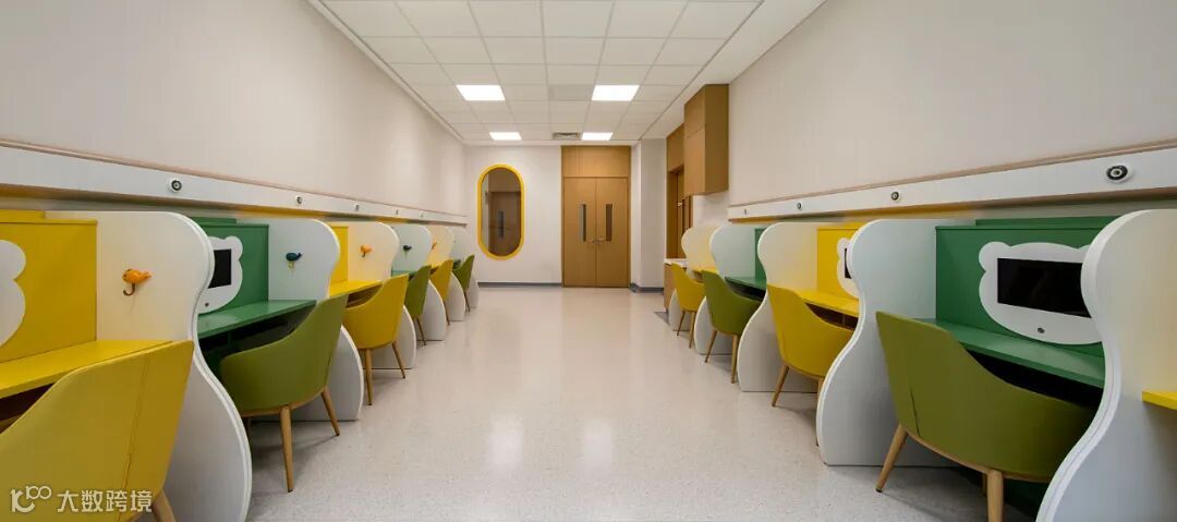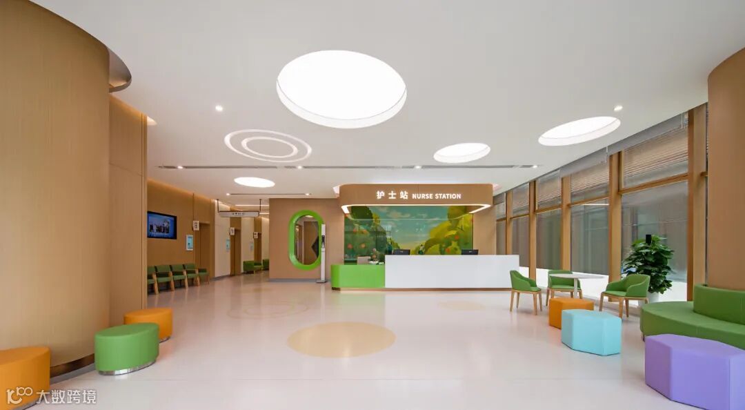 护士站薄荷绿台面及弧形门洞的荧光绿边框,呼应背景墙的 “森林壁画”,将 “自然疗愈” 植入空间核心。
