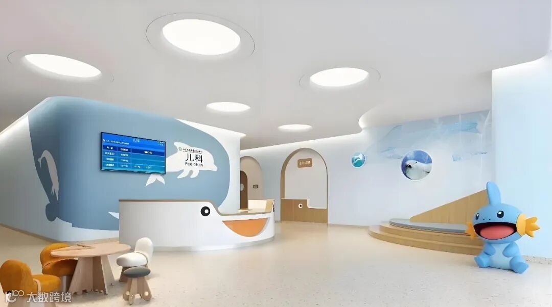 儿科候诊区以浅蓝、白色为主,营造清新、柔和的海洋意境,整体设计围绕 海洋主题 与 童趣氛围 展开,意在缓解儿童就医的紧张感。