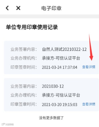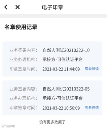 (3)若已使用过的印章,会展示相关签署列表,如下图:可点击“查看详情”