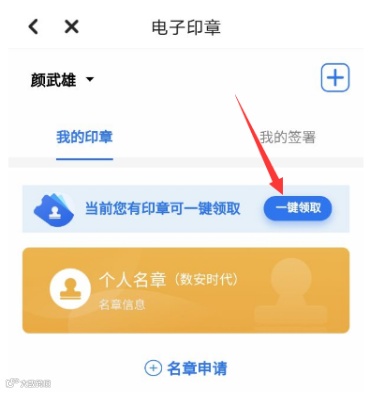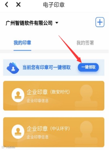 (1)印章申请成功后,刷新页面则出现“一键领取”功能,点击“一键领取”
