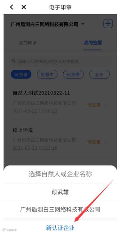 (1)进入我的签署页面,列表展示“待签署”、“签署中”、“已签署”、“全部”相关状态。