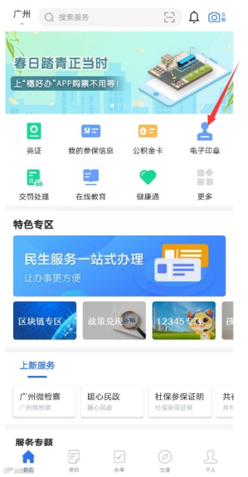 (1)登录成功后,在穗好办首页找到电子印章图标