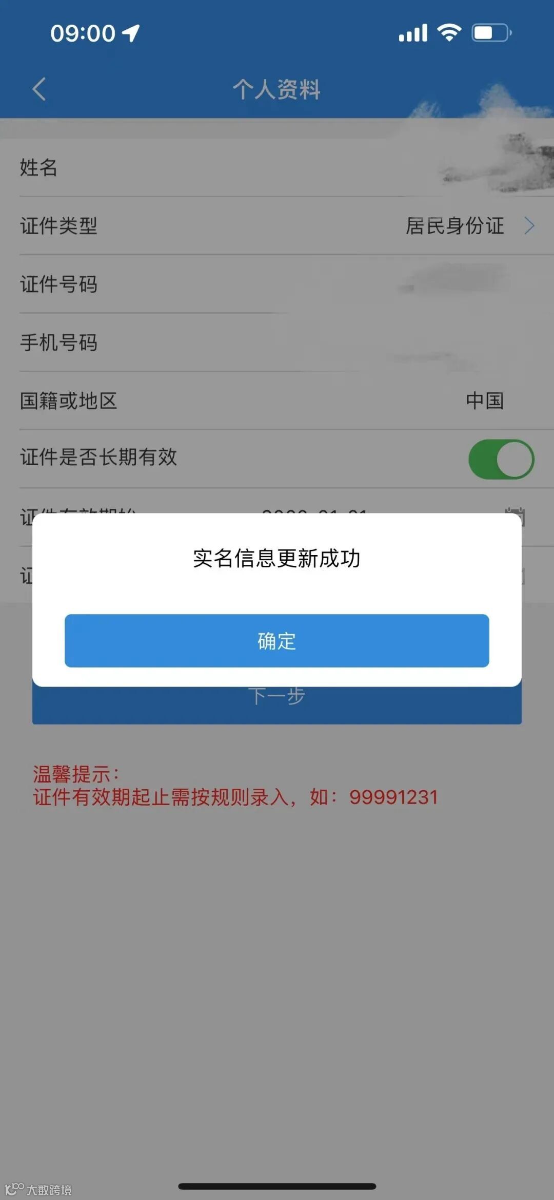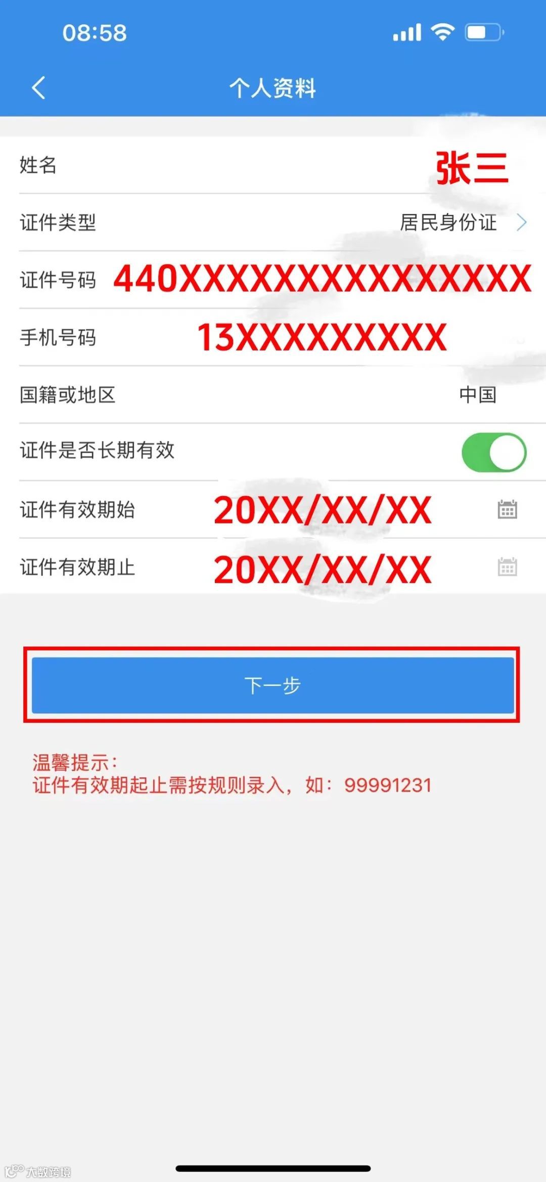 填写真实个人信息,点击下一步。