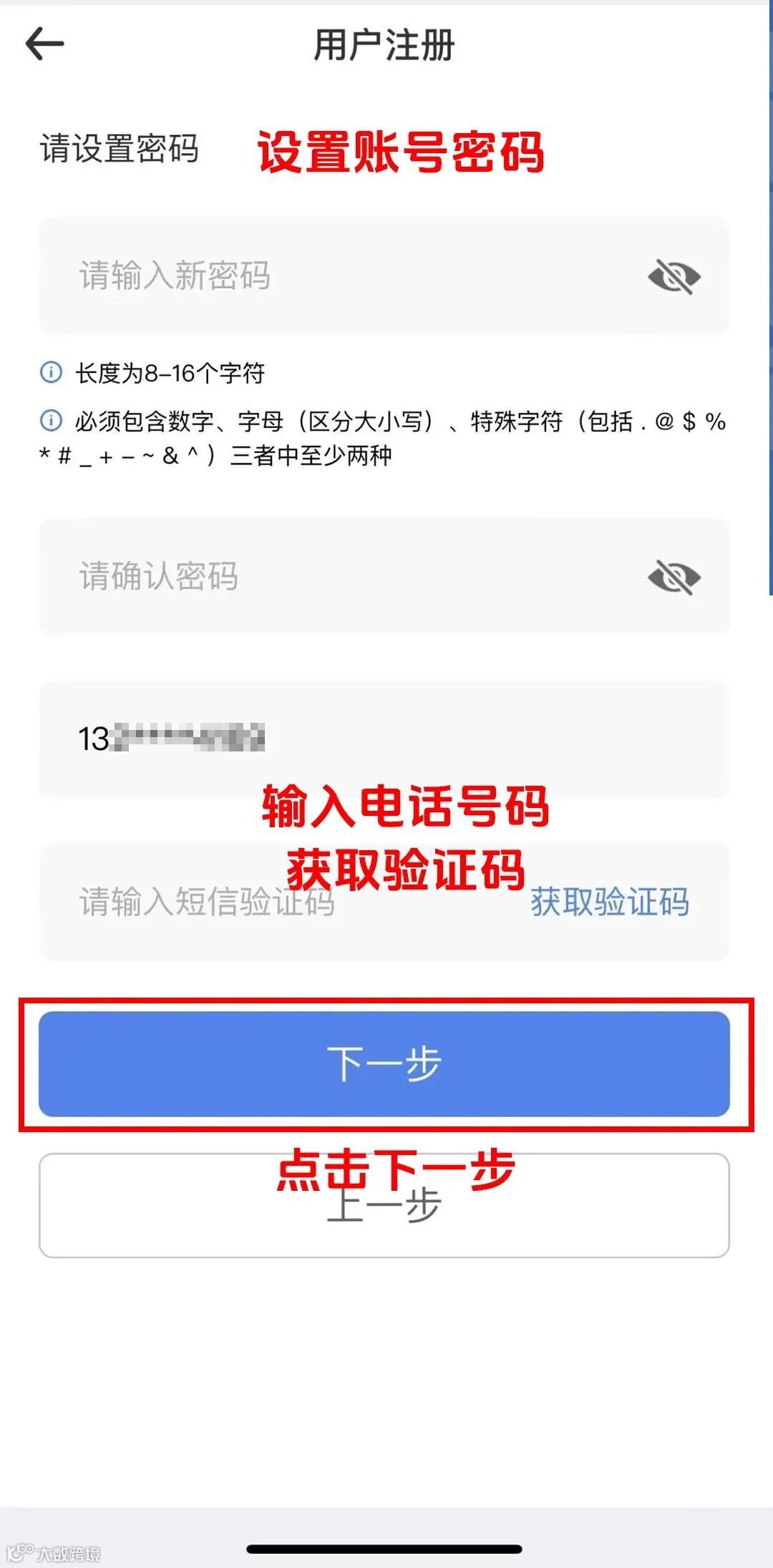 获取验证码后点击下一步
