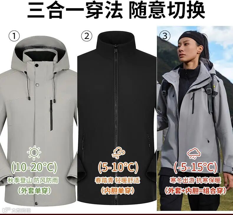 灵活组合:冲锋衣三合一的设计允许用户根据天气变化和个人需求进行灵活的拆卸和组合。例如,在气温较高时,可以单独穿着冲锋衣外套;在气温较低时,则可以加上保暖内胆以增强保暖效果。