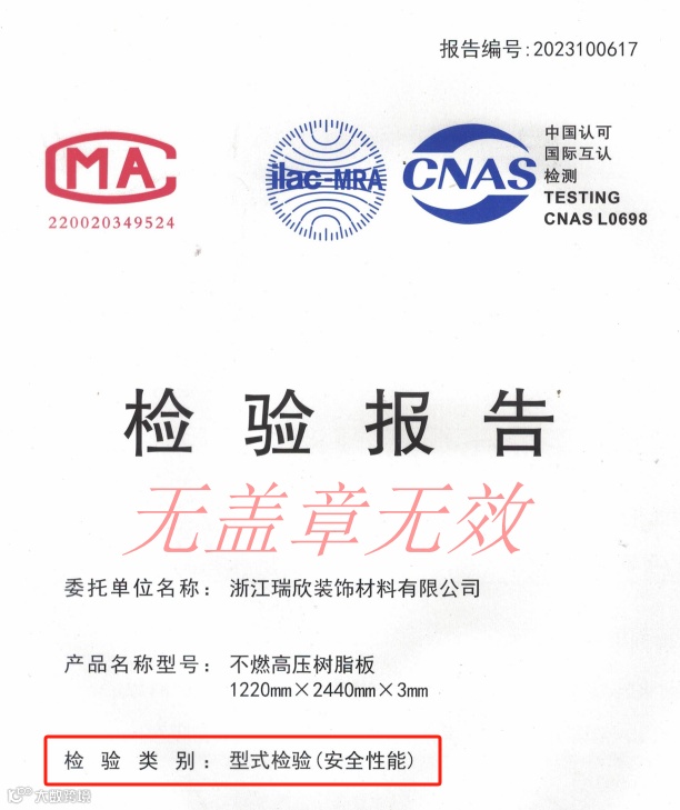 •不燃高压树脂板提供现场任意抽检100%过检A级不燃的型式检验报告。(传统送检报告见针对来样负责并不对现场大货负责)