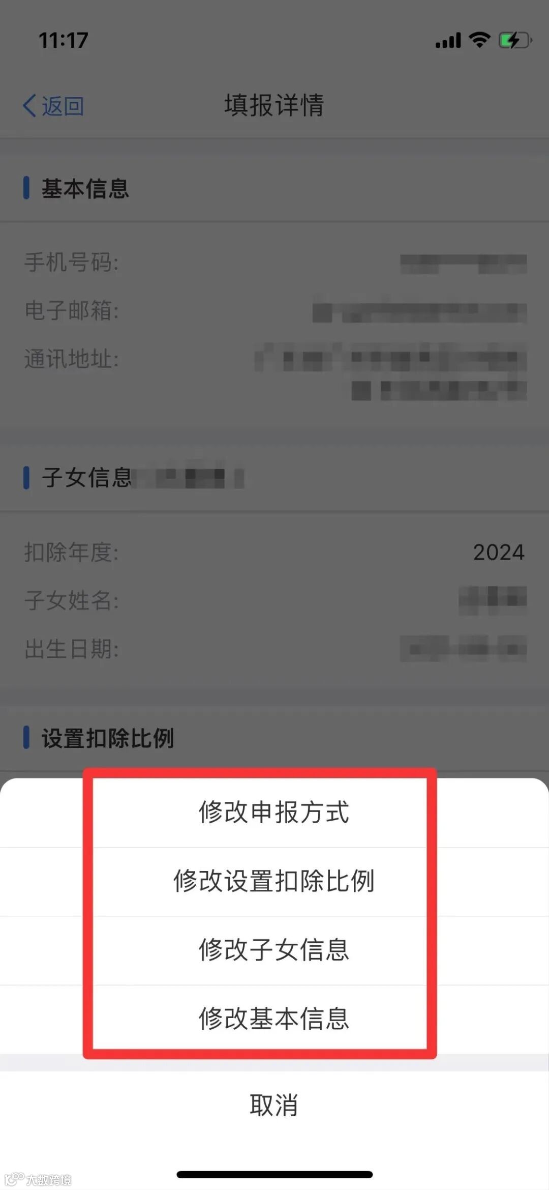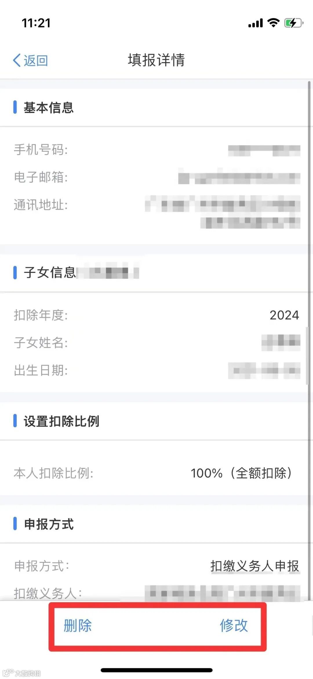 在填报详情页面,点击【删除】或【修改】,可按提示选择修改申报方式、修改设置扣除比例、修改子女信息或修改基本信息。