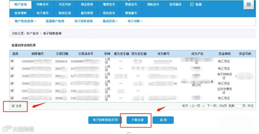 1.登入建设银行网上银行首页,点击【电子回单查询】并选择起止日期后,点击【确定】;