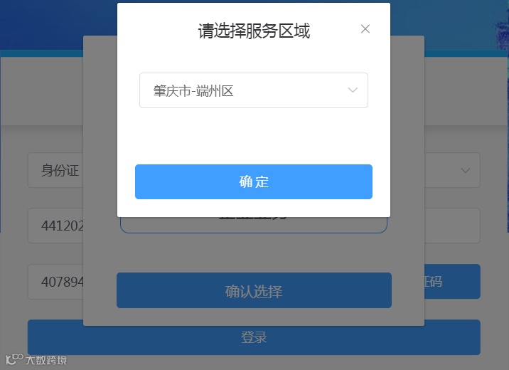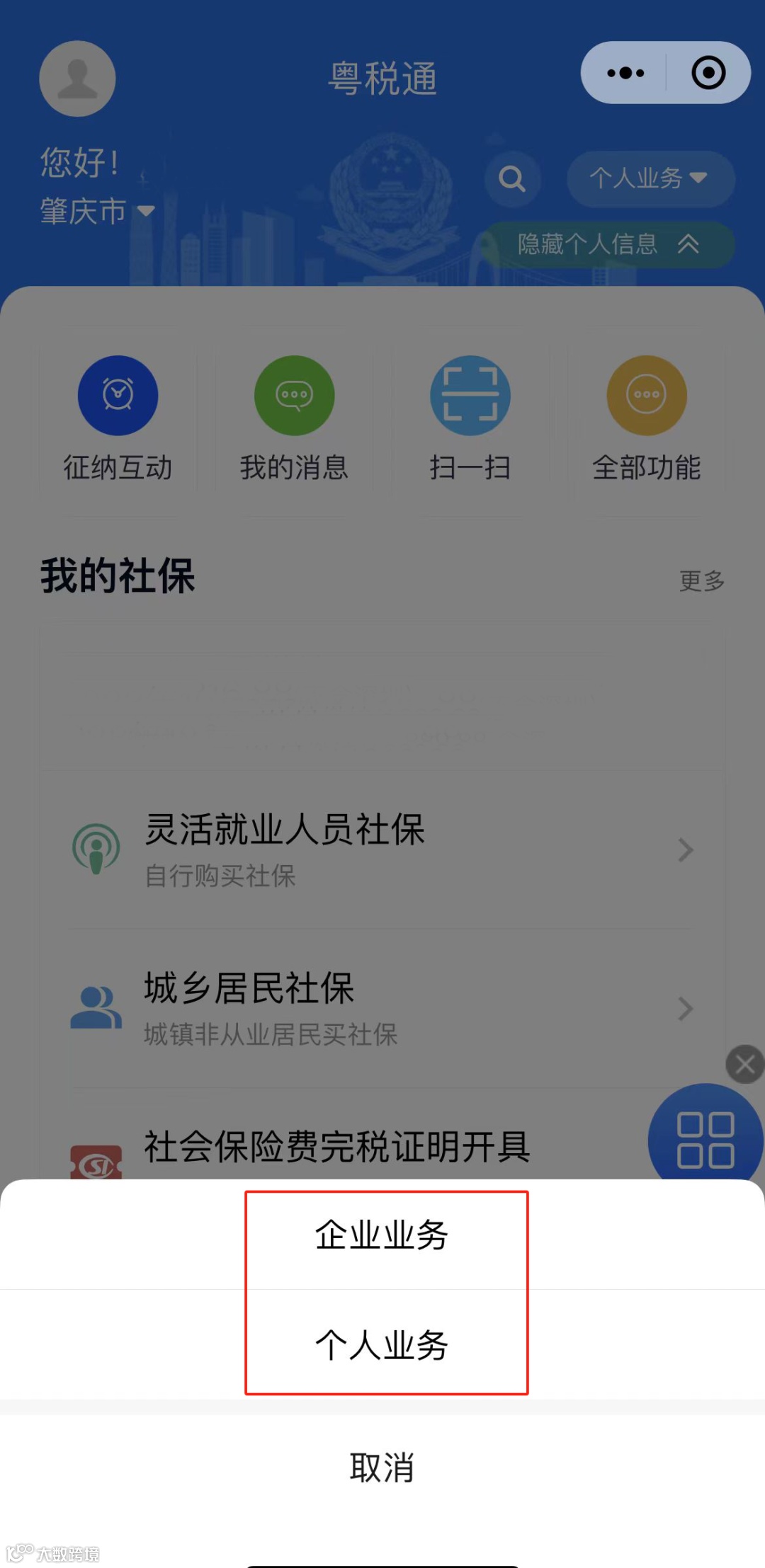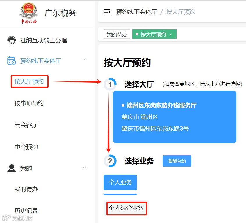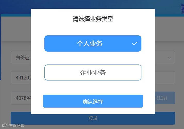 2.选择业务办理类型:个人业务/企业业务,并选择服务区域。