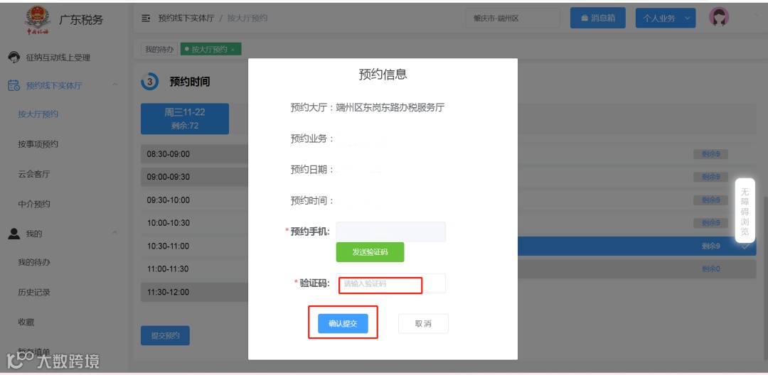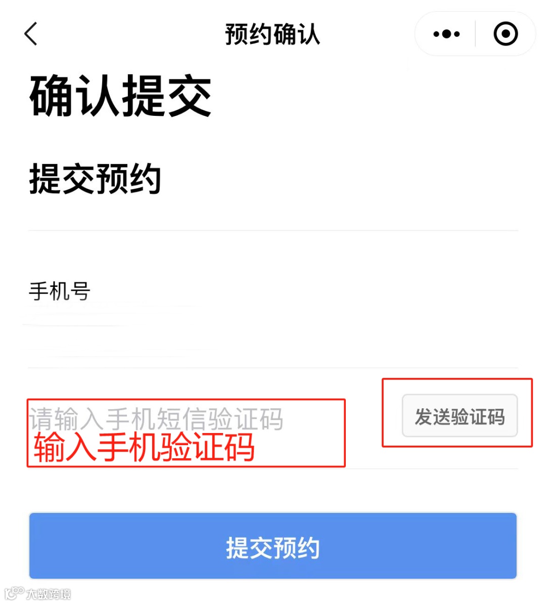 7.点击“发送验证码”,输入手机验证码后点击“提交预约”即可完成预约。