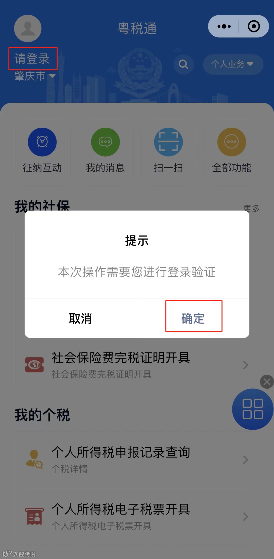 2.粤税通界面点击右上角“请登录”按提示进行登录验证(人脸识别登录/电子营业执照登录/账户密码登录)。