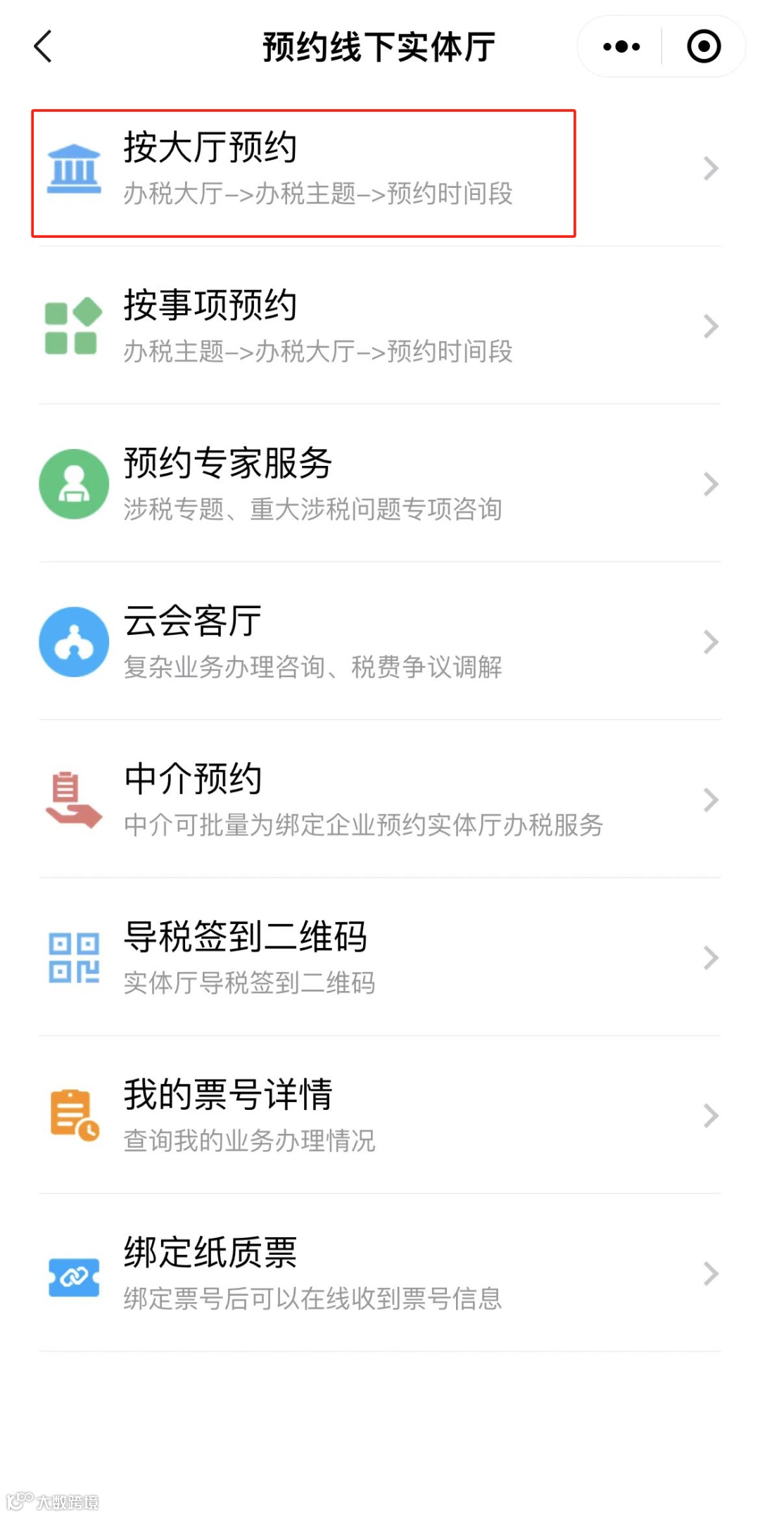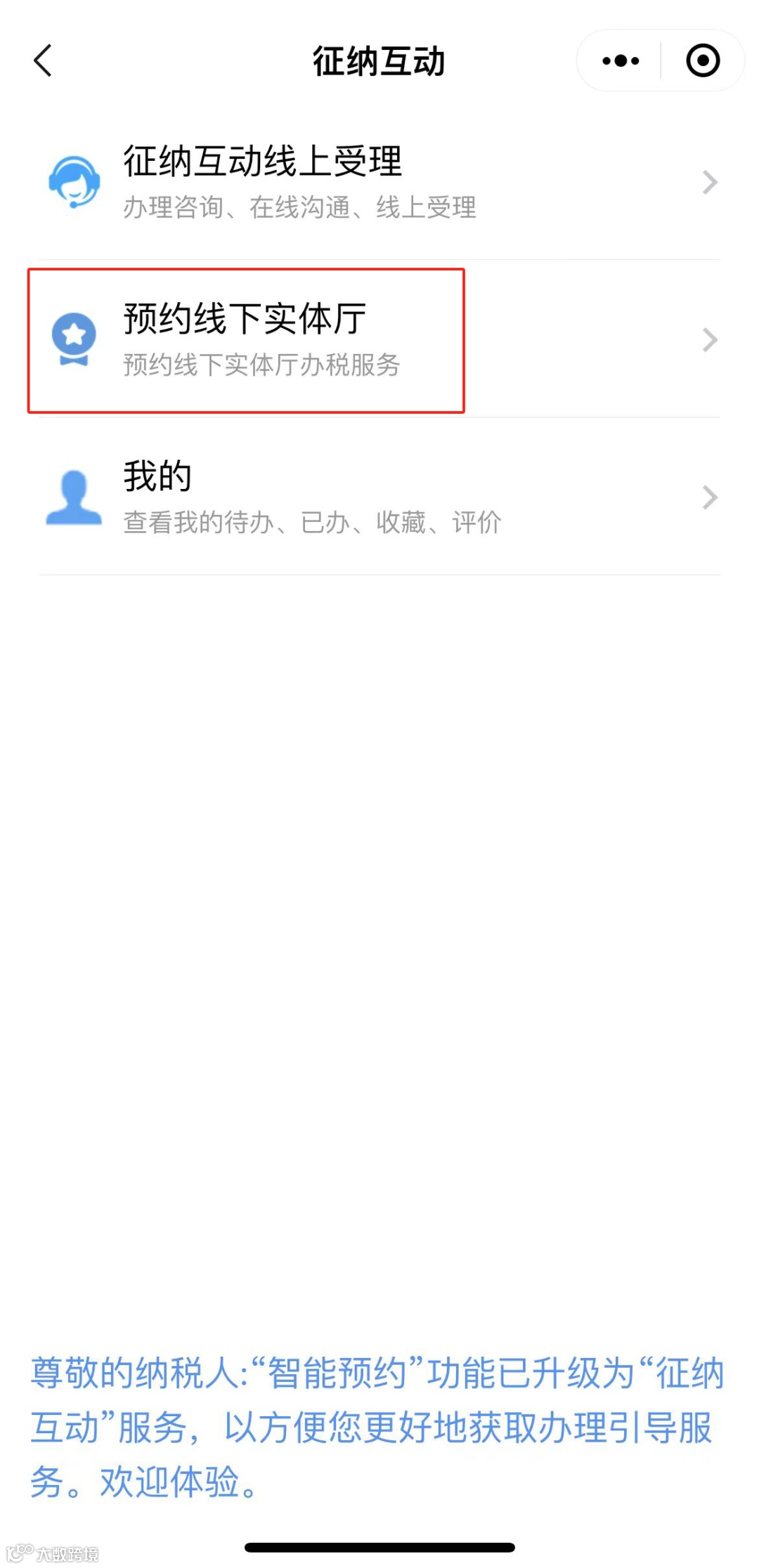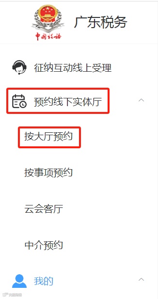 3.进入征纳互动页面,左侧菜单选择“预约线下实体厅”-“按大厅预约”。