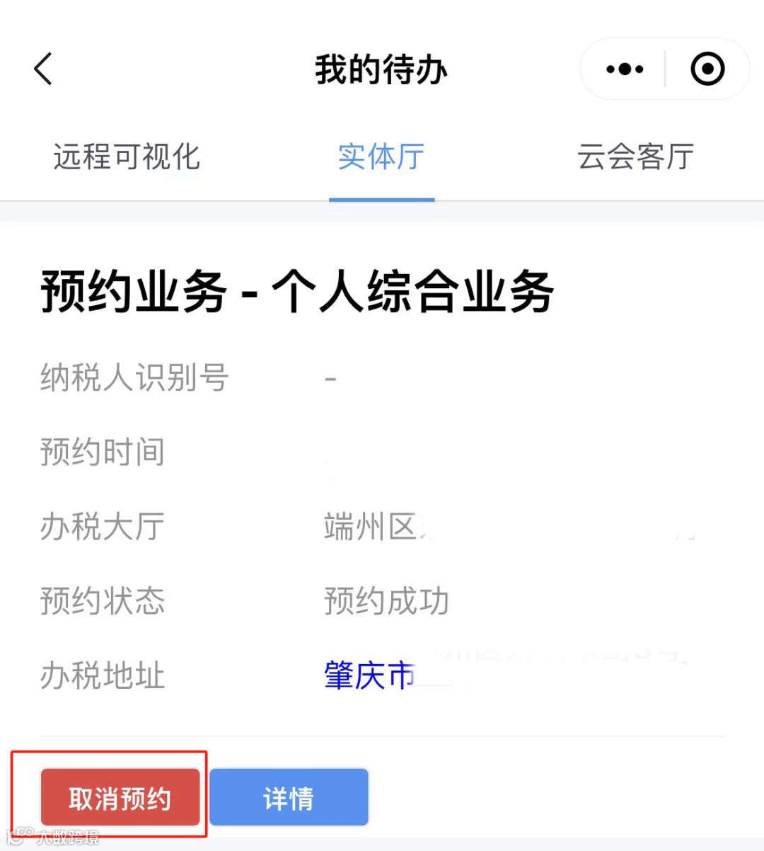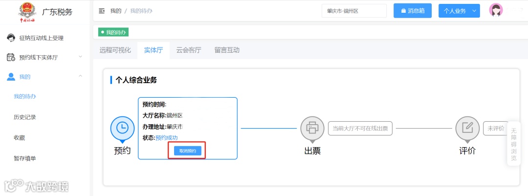 1.如果无法按时前往办税服务厅办理业务,可以通过“我的待办”-“实体厅”-“取消预约”。