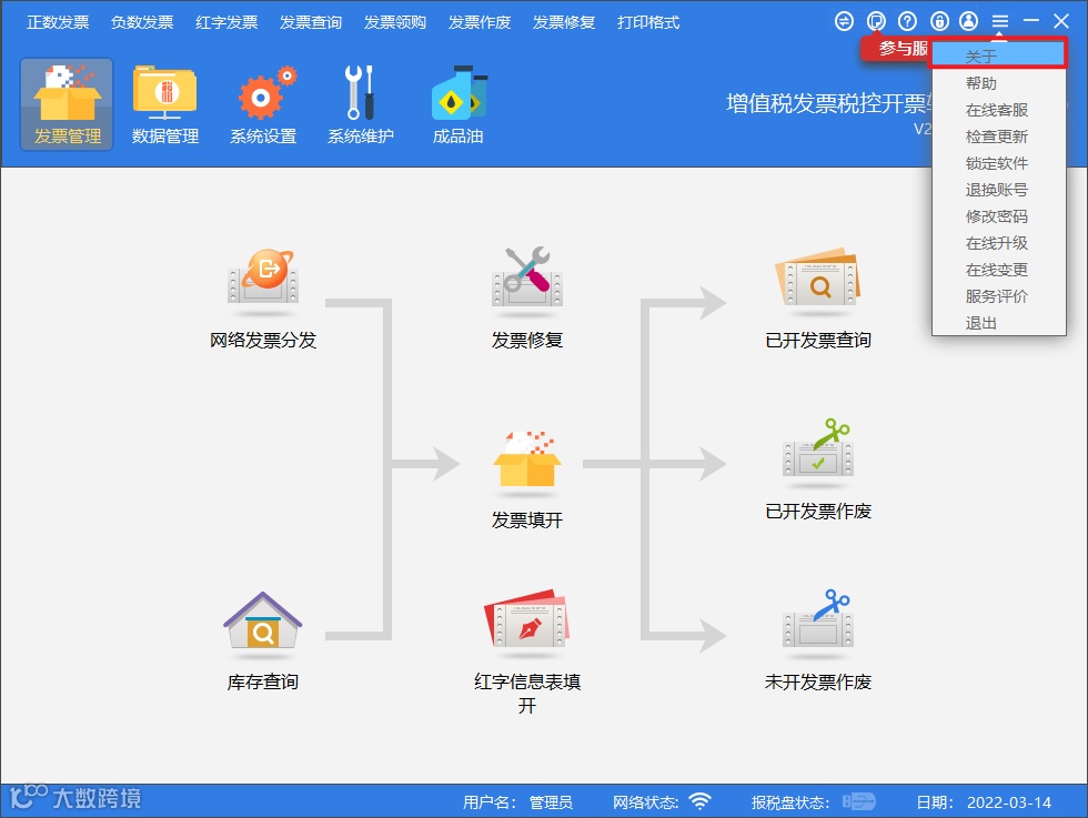 升级之后,开票软件登录界面和关于界面显示版本号V2.0.62_ZS_20231031。