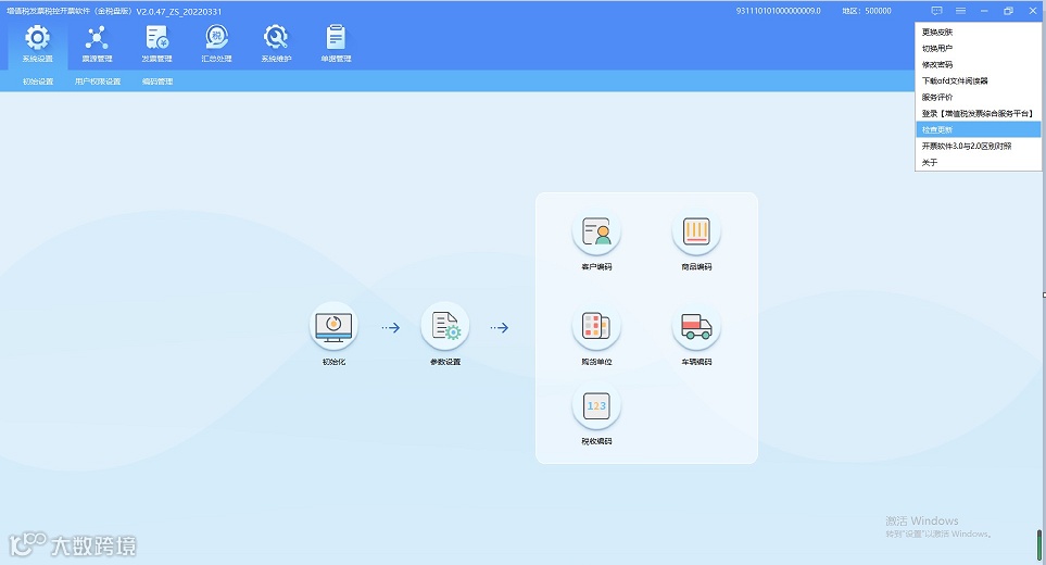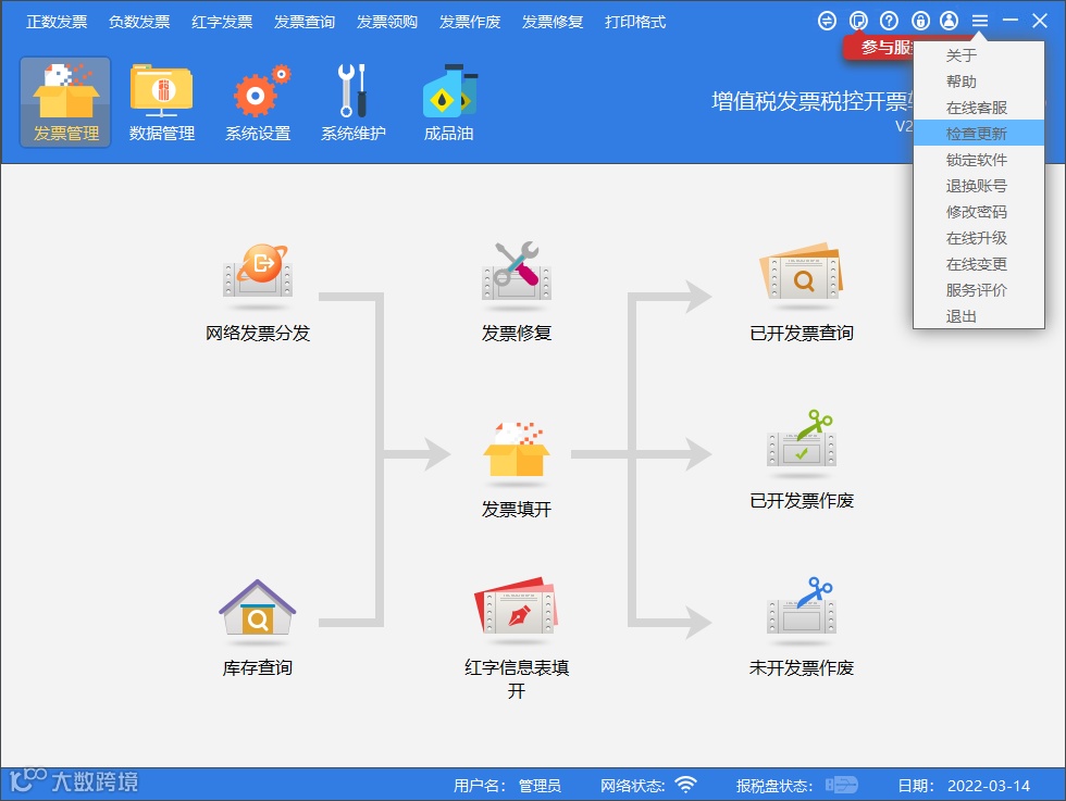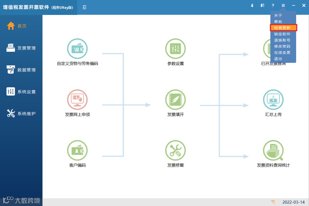 纳税人进入开票软件后,选择“检查更新”,系统会自动对软件进行升级,并弹出正在升级提示框,纳税人可根据提示完成升级。