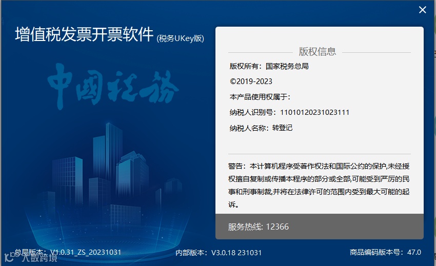 1.增值税发票开票软件(税务UKey版)版本号: V1.0.31_ZS_20231031;