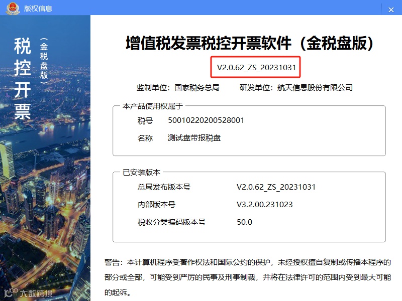 2.增值税发票税控开票软件(税控盘版)版本号:V2.0.62_ZS_20231031;