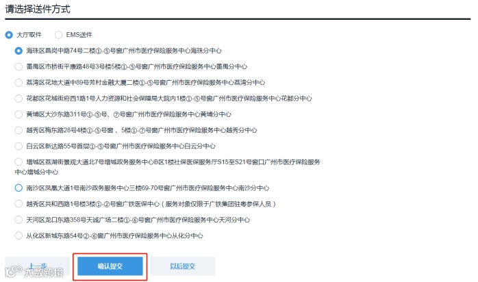 7.选择就近的经办机构后点击“确认提交”(这里是以防万一需要递交资料,一般情况下不需前往)