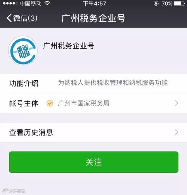 1、用微信扫一扫“广州税务企业号”二维码或微信公众号搜索“广州税务企业号”,进行关注。(用实名认证认证手机号绑定的微信)
