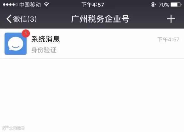 2、关注成功后,“广州税务企业号”会推送一个身份验证的消息