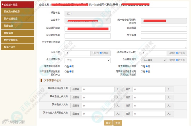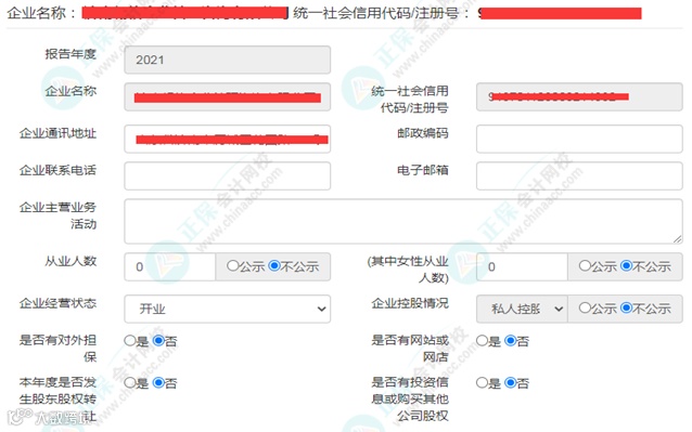 提示:填报项目中 “是否有对外担保”“是否有网站或网店”、“本年度是否发生股东股权转让”、“是否有投资信息或购买其他公司股权”、如果选择“否”,则后面对应的标签页将隐藏。如果选择“是”,则需要另外填报相关信息!