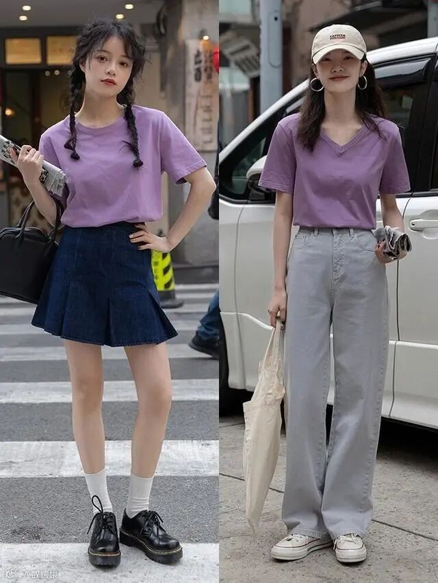 还有一些小姐姐会选择一些个性化的色彩,比如今年很流行紫色,你也可以用这种紫色的T恤凹造型,看上去挺显年轻。肤色暗沉的话也可以穿,非常时尚。