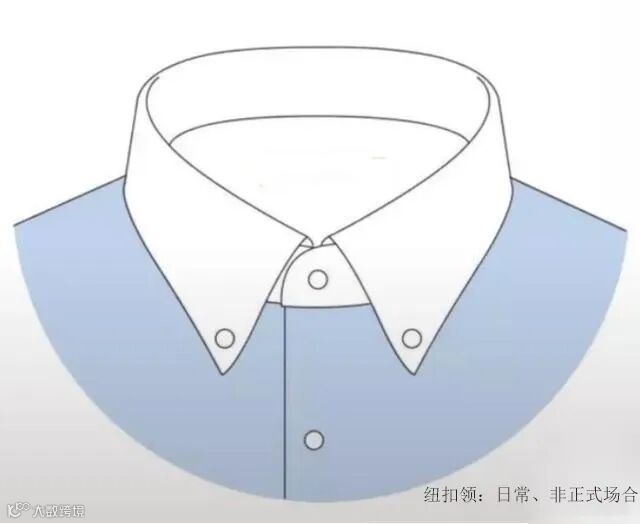 纽扣领是领尖带扣的的衬衫。典型美式风格衬衫,领带以只绕一圈的细结为佳,这里插播一个小知识点 在左右领夹角大于75度的非礼服衬衫中,一般夹角越大越正式,但是纽扣领除外,不管他的领夹角多大都不太正式,这款领型多用于日常或不那么正式的场合。