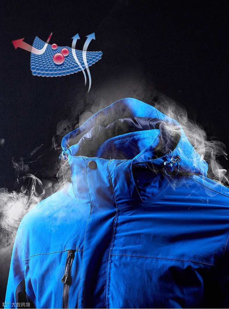 3、第三层也是最主要的防线:防水薄膜;冲锋衣-般采用聚四氟乙烯(PTFE薄膜)进行压合 ,这层薄膜的空隙比水分子小比气体分子大,所以能有效阻挡水分子进入,同时能够将身体生的湿气排出体外,保证身体的干燥温暖,使其在潮湿的地方或风雨交加的环境中也能够有效地阻挡雨水和霜雪的入侵。
