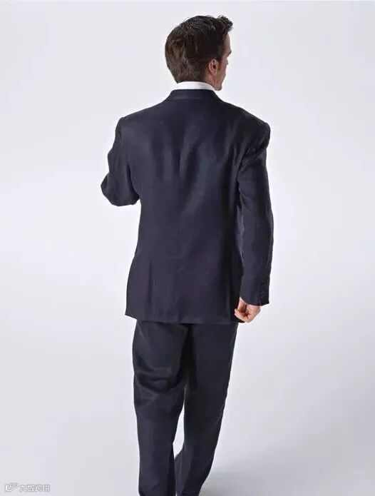 前面的平衡度:当西装穿在身上时,解开钮扣,西装的两个前片位置不变,既不会往后侧张开,也不会往前中交叉,那么这件西装的版型平衡度就是较好。相反,如果解开扣子后,西装的两个前片往后侧张开,或者往前中交叉,这件西装的平衡度就有问题。一般来说,这类问题往往是由于肩斜角度过大或过小,造成了受力点不均匀所造成的。