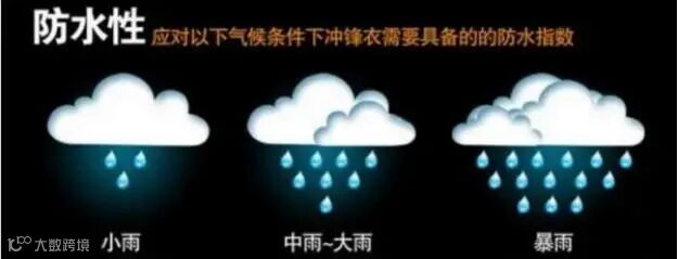 防水指数(单位:mmh20,毫米水柱压):简单来说防水指数为10000mmH2O的面料可以让10000mm高的水柱压在上面,24小时内从面料渗出的水不超过3滴。不同的防水指数可以应对不同的气候条件,冲锋衣面料的防水指数与之相对应的性能可直观地参照下图。