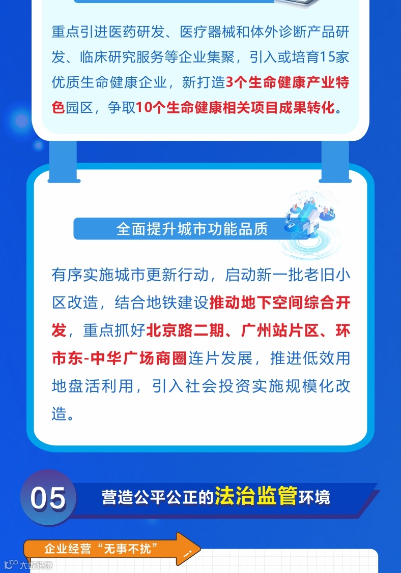 加快推动粤港澳大湾区生命健康产业创新区建设,推进医技医药医疗器械研发企业及营销等机构集聚,引入或培育15家优质生命健康企业,新打造3个生命健康产业特色园区。深化粤港澳大湾区信用服务产业(越秀)基地建设,加速信用产品创新研发应用,拓宽信用走廊、诚信商圈等应用覆盖。