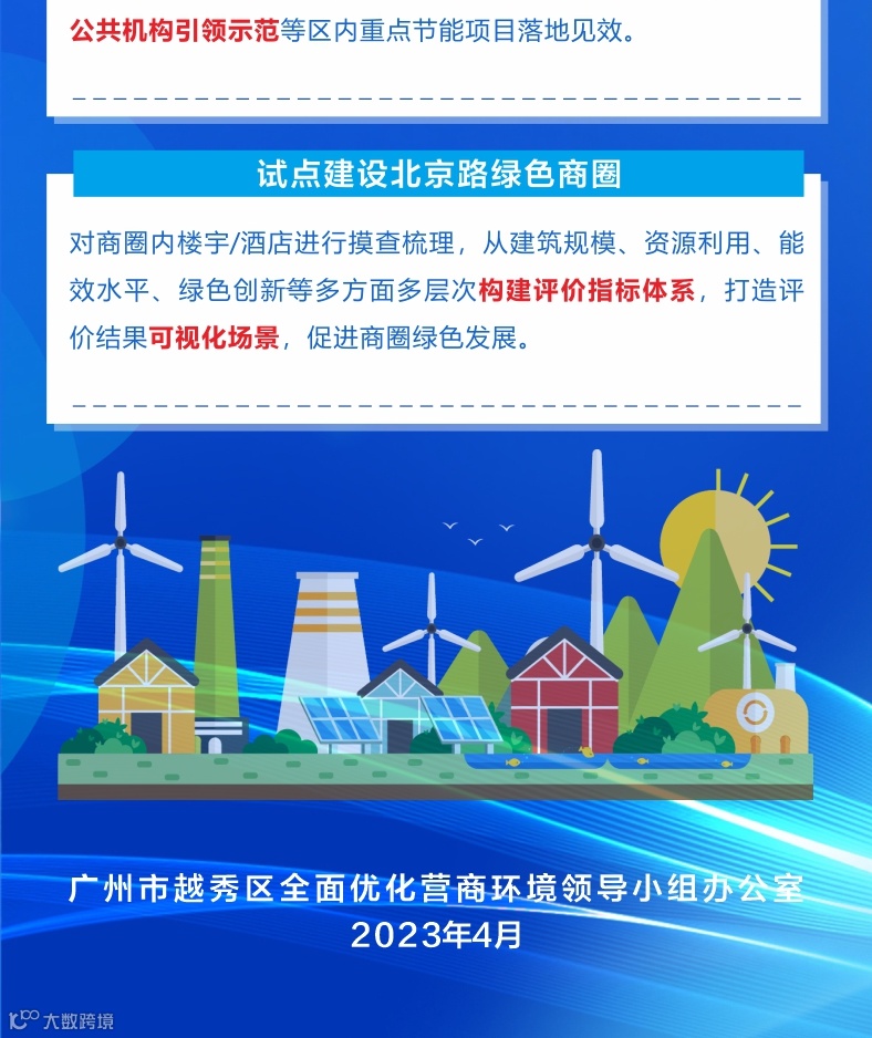 试点建设北京路绿色商圈,探索在北京路等重点商圈开展能效摸查,根据商圈现状,从建筑规模、资源利用、能效水平、绿色创新等多方面多层次构建评价指标体系,打造评价结果可视化场景,持续推进能耗计量监测和节能改造,促进商圈提升用能管理水平。
