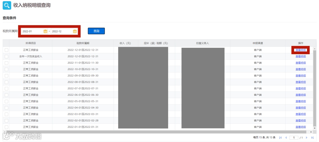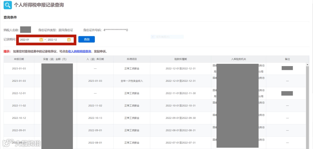 3. 跳转相关界面后,选择【记录期间】或【税款所属期】,如2022年1月-2022年12月,即可显示【个人所得税申报记录查询】或【收入纳税明细查询】结果。