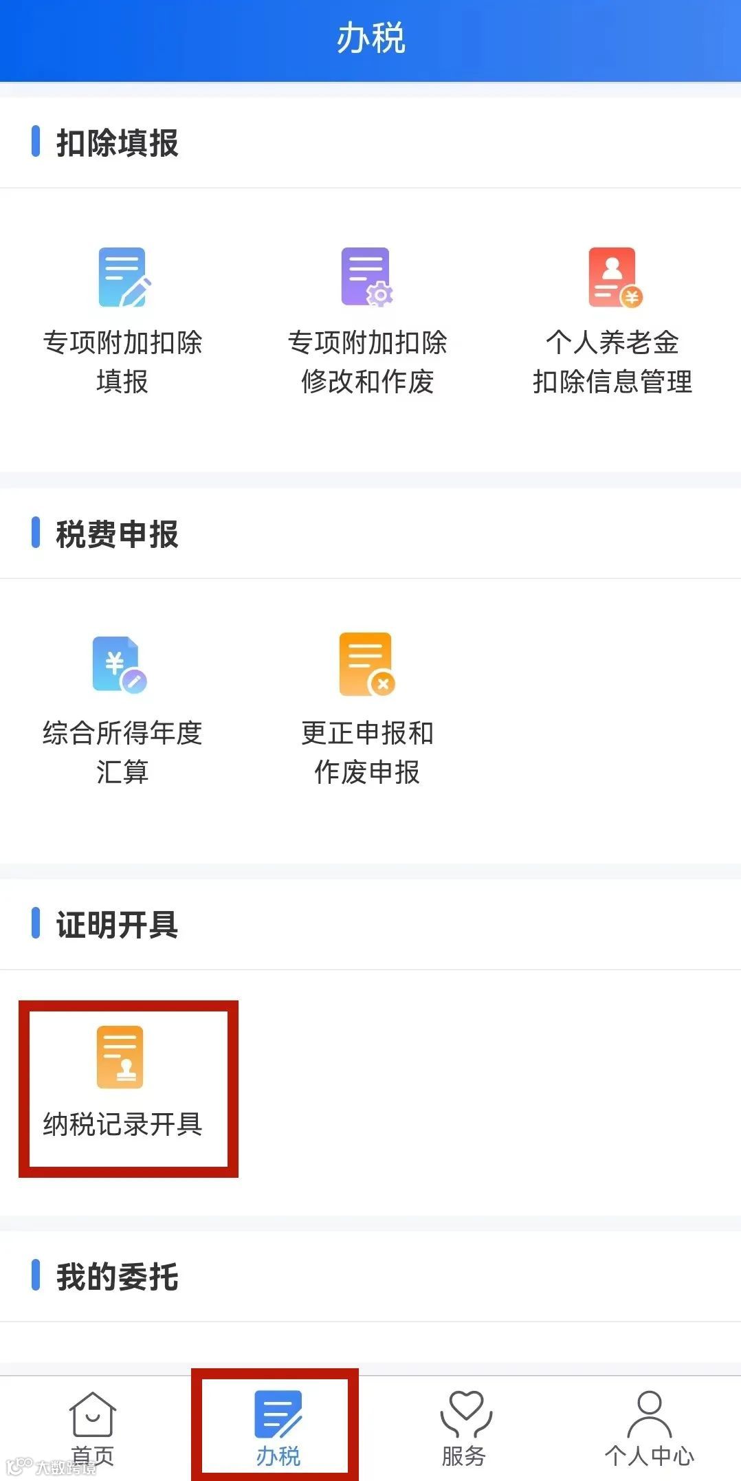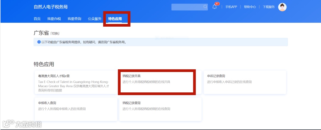 1. 登录自然人电子税务局(https://etax.chinatax.gov.cn/),进入【特色应用】页面,点击【纳税记录开具】