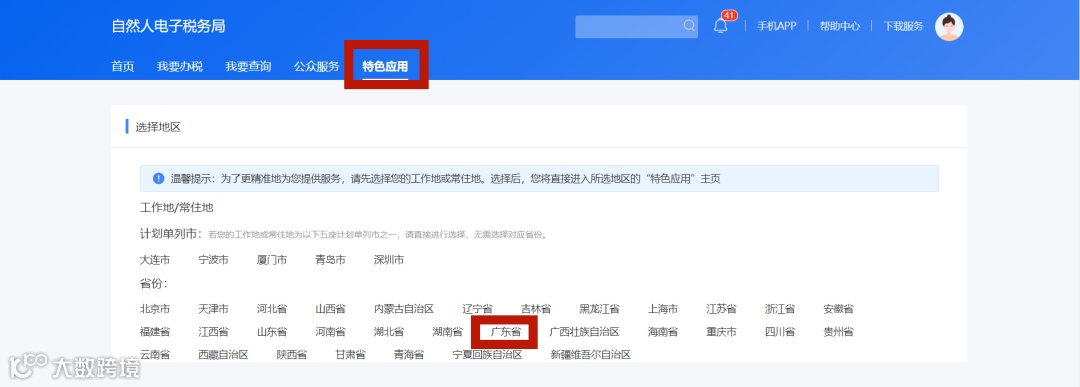 1. 打开自然人电子税务局WEB端(https://etax.chinatax.gov.cn/),登录后进入【特色应用】页面,选择省份