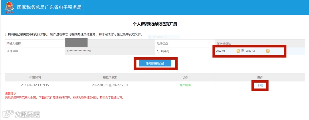 3. 纳税记录下载后的文件,需凭密码打开,密码为身份证后6位,若包含字母请大写