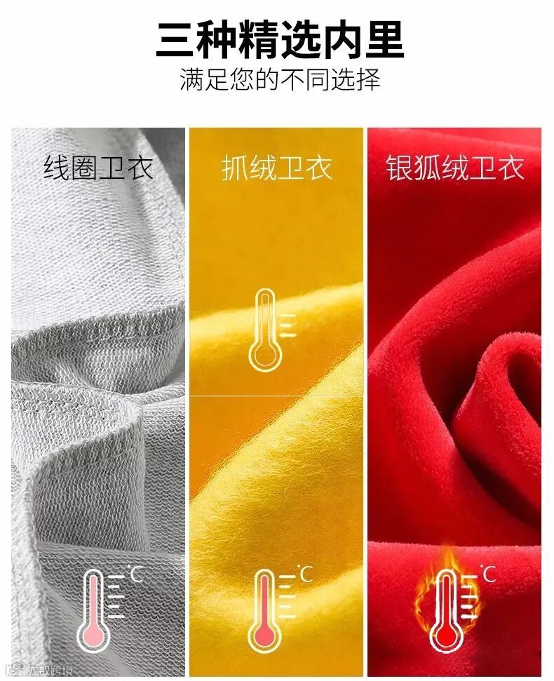 在冬季,最受欢迎的是加绒卫衣。春秋可以选择稍薄款,线圈布卫衣。