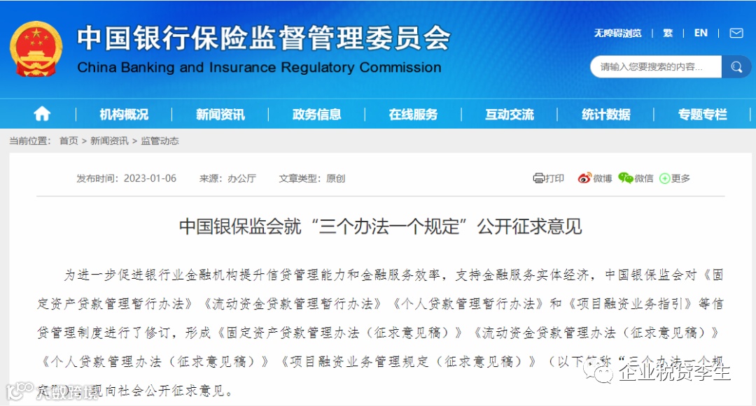 近日,银保监会发布《固定资产贷款管理办法(征求意见稿)》《流动资金贷款管理办法(征求意见稿)》《个人贷款管理办法(征求意见稿)》《项目融资业务管理规定(征求意见稿)》(以下简称“三个办法一个规定”),面向社会公开征求意见。
