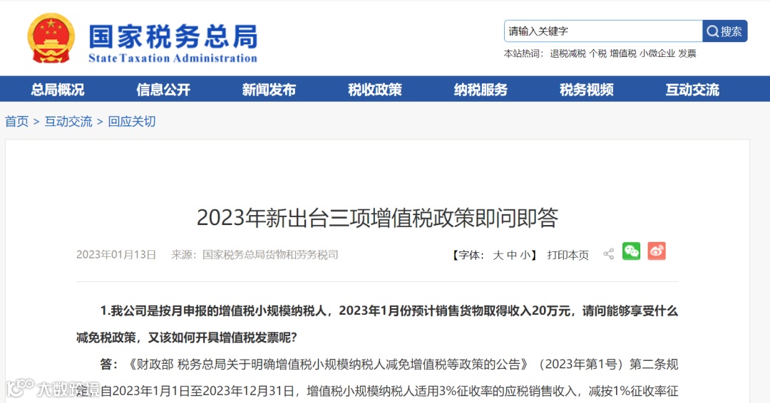 答:《财政部 税务总局关于明确增值税小规模纳税人减免增值税等政策的公告》(2023年第1号)第二条规定,自2023年1月1日至2023年12月31日,增值税小规模纳税人适用3%征收率的应税销售收入,减按1%征收率征收增值税。《国家税务总局关于增值税小规模纳税人减免增值税等政策有关征管事项的公告》(2023年第1号)第一条规定,增值税小规模纳税人发生增值税应税销售行为,合计月销售额未超过10万元(以1个季度为1个纳税期的,季度销售额未超过30万元)的,免征增值税。第九条规定,按照现行规定应当预缴增值税税款的小规模纳税人,凡在预缴地实现的月销售额未超过10万元的,当期无需预缴税款。在预缴地实现的月销售额超过10万元的,适用3%预征率的预缴增值税项目,减按1%预征率预缴增值税。
