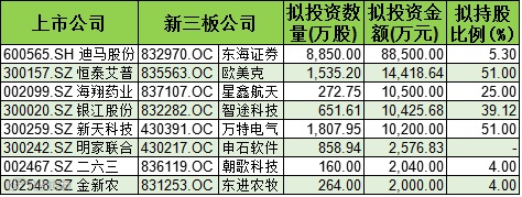 在计划投资部分,投资金额最高的是迪马股份收购东海证券,达8.85亿元,盖因证券公司市值较大。在计划持有的8850万股中,迪马股份已经完成了3850万股的过户,经营房地产的迪马股份即将跨界涉足金融业。恒泰艾普、海翔药业分别以1.44亿元、1.05亿元分列二三位。